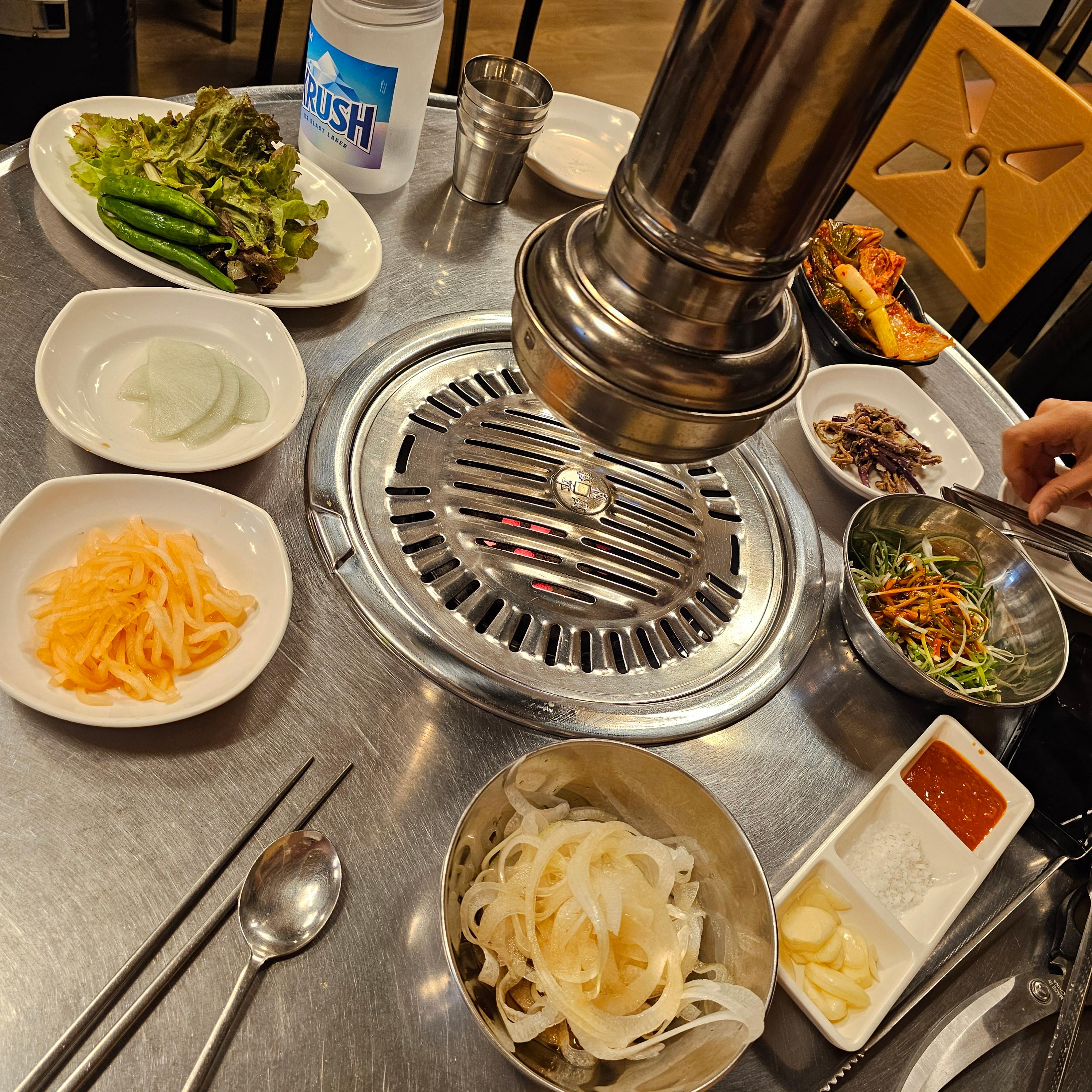 주문과 동시에 두툼하게 썬 고기가 테이블 위에 올려지고, 연탄불 위에 올려진 고기가 지글거리며 익어가는 소리는 그야말로 예술입니다.